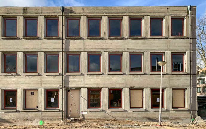 Het voormalige GGD-gebouw in Amersfoort wordt omgebouwd tot negen stadswoningen en drie herenhuizen. Het GGD-kantoor is sinds 2016 een gemeentelijk monument. Monumentale kenmerken moeten bewaard blijven, een van die kenmerken is typisch brutalistisch: het gebruik van béton brut, waarin de afdruk van de bekisting zichtbaar is. Dit zorgt ervoor dat de brute betonnen gevel een bijzonder lijnenspel laat zien.